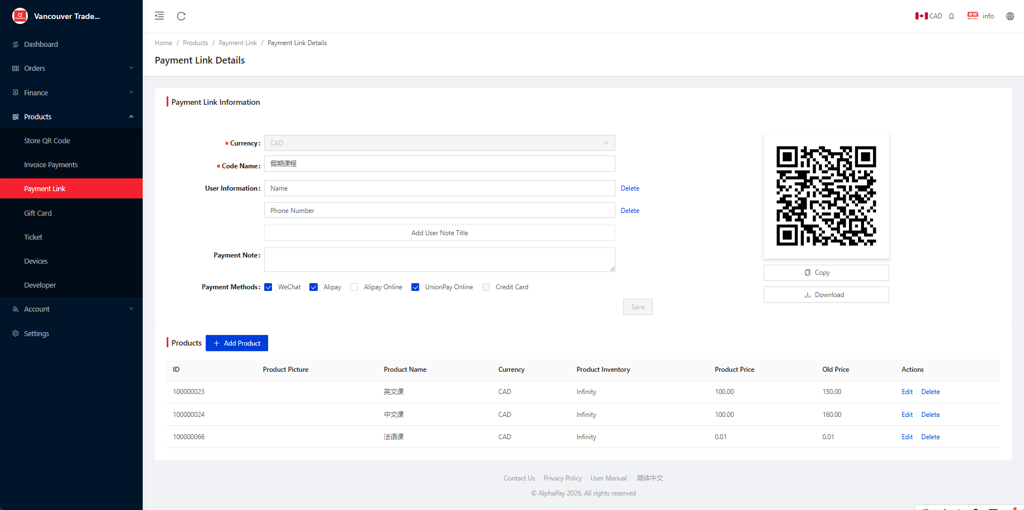 - Choose Products > Payment Link and simply enter payment page information: Order Amount, User information, Payment Methods, Description and Payment Note
