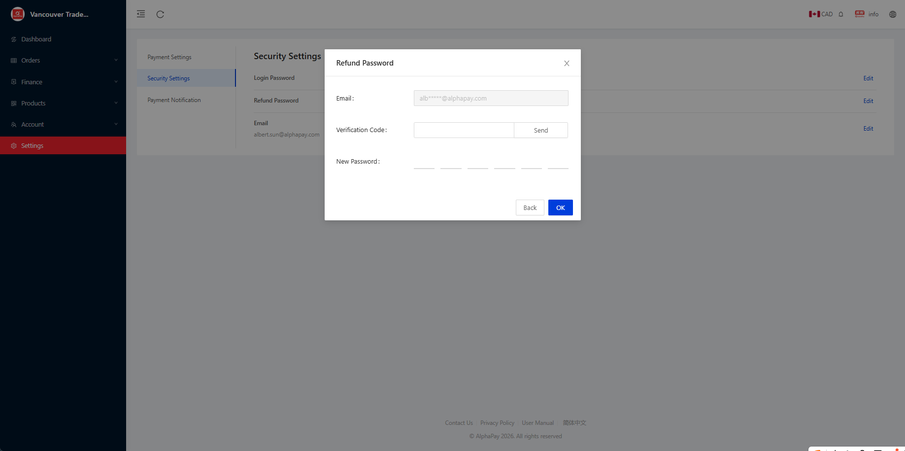 Click Send to receive the verification code, enter your new password, and click OK.