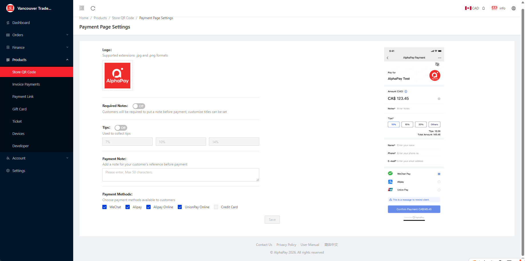 Payment page settings allow merchants to customize user information, tip options, mandatory notes, merchant prompts, payment methods, and other configurations to meet the needs of merchants in different scenarios.