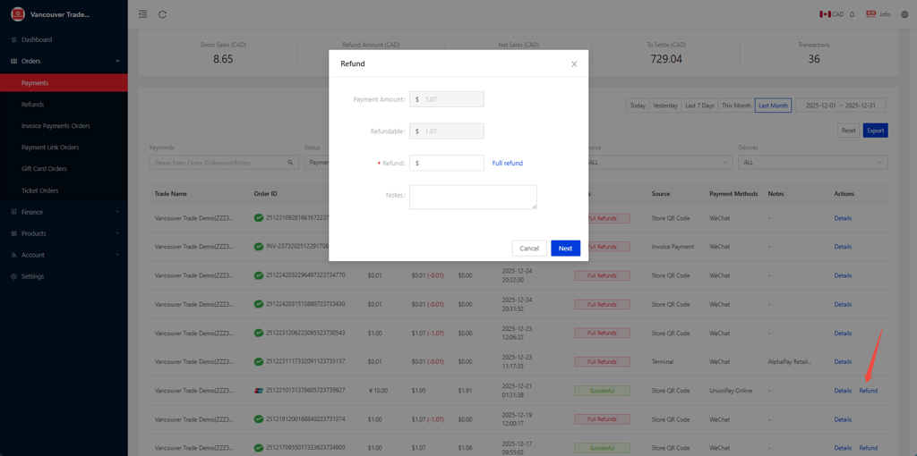 - Select the order(or Scan the refund QR Code on the receipt) then click REFUND