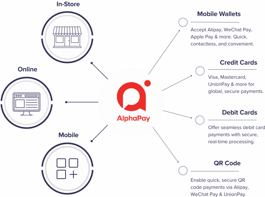 Accept mobile wallets, credit and debit cards, and QR code payments across in-store, online, and mobile channels with AlphaPay’s all-in-one platform.