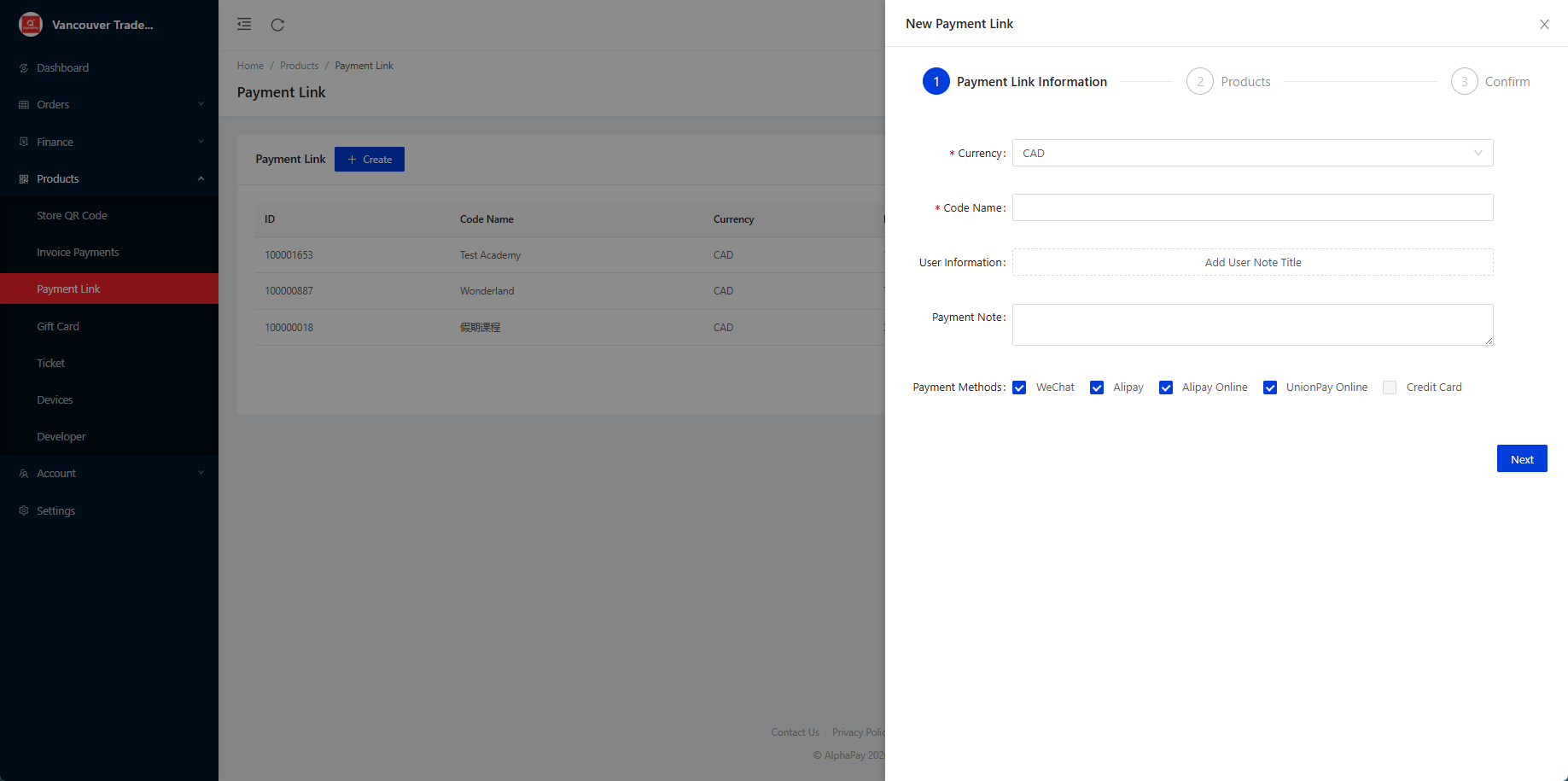 - Choose Products > Payment Link and simply enter payment page information: Order Amount, User information, Payment Methods, Description and Payment Note