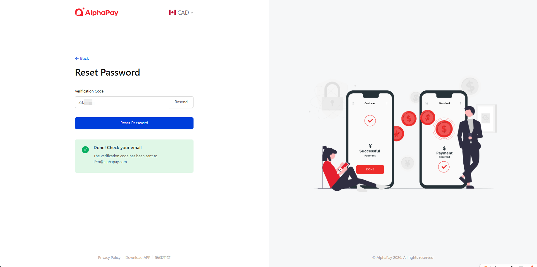 After submitting, check your email for the verification code. Enter the code and click Reset Password.