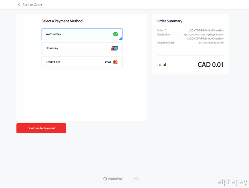 • Select a supported AlphaPay method (e.g., WeChat Pay)