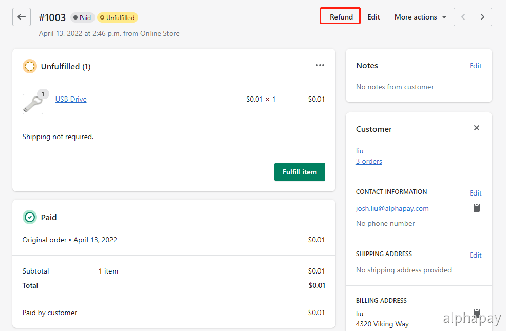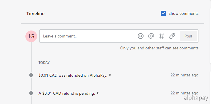 The refund will be sent back via the customer’s original AlphaPay method automatically.