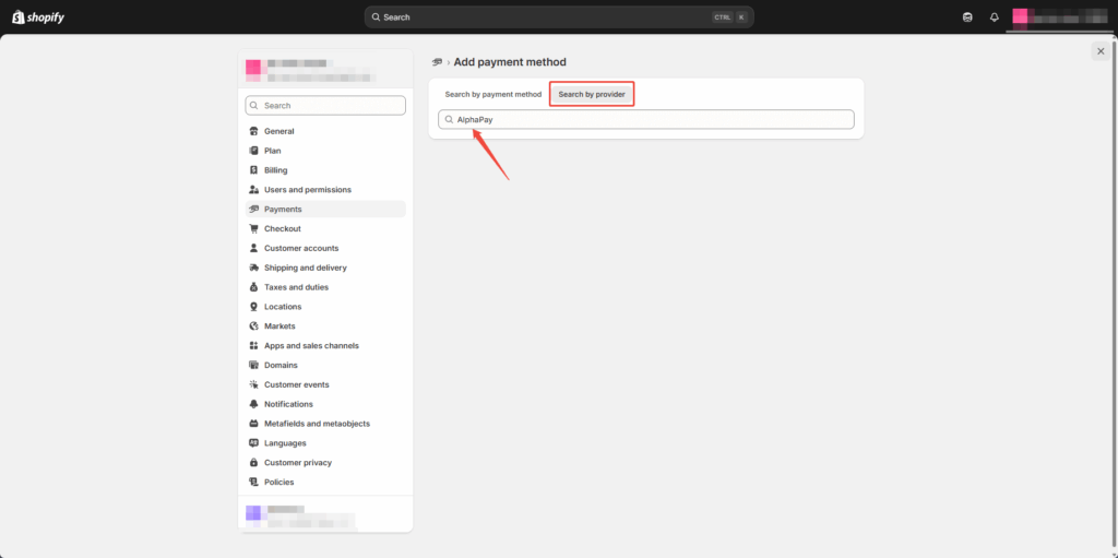 Click “Search by provider” and search for “AlphaPay”. Select and proceed to install the plugin.