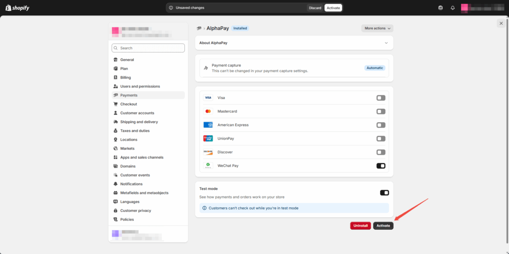 Once your credentials are entered, configure the payment methods you’d like to support (WeChat Pay, Alipay, UnionPay) and click Activate to confirm.